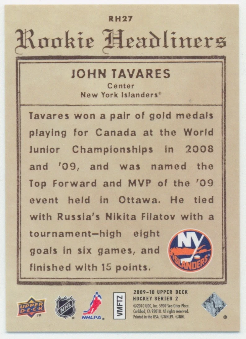 It's time to level up your collection. 2009-10 Upper Deck John Tavares Rookie Headliners #RH27 Thanks for looking, happy collecting!
