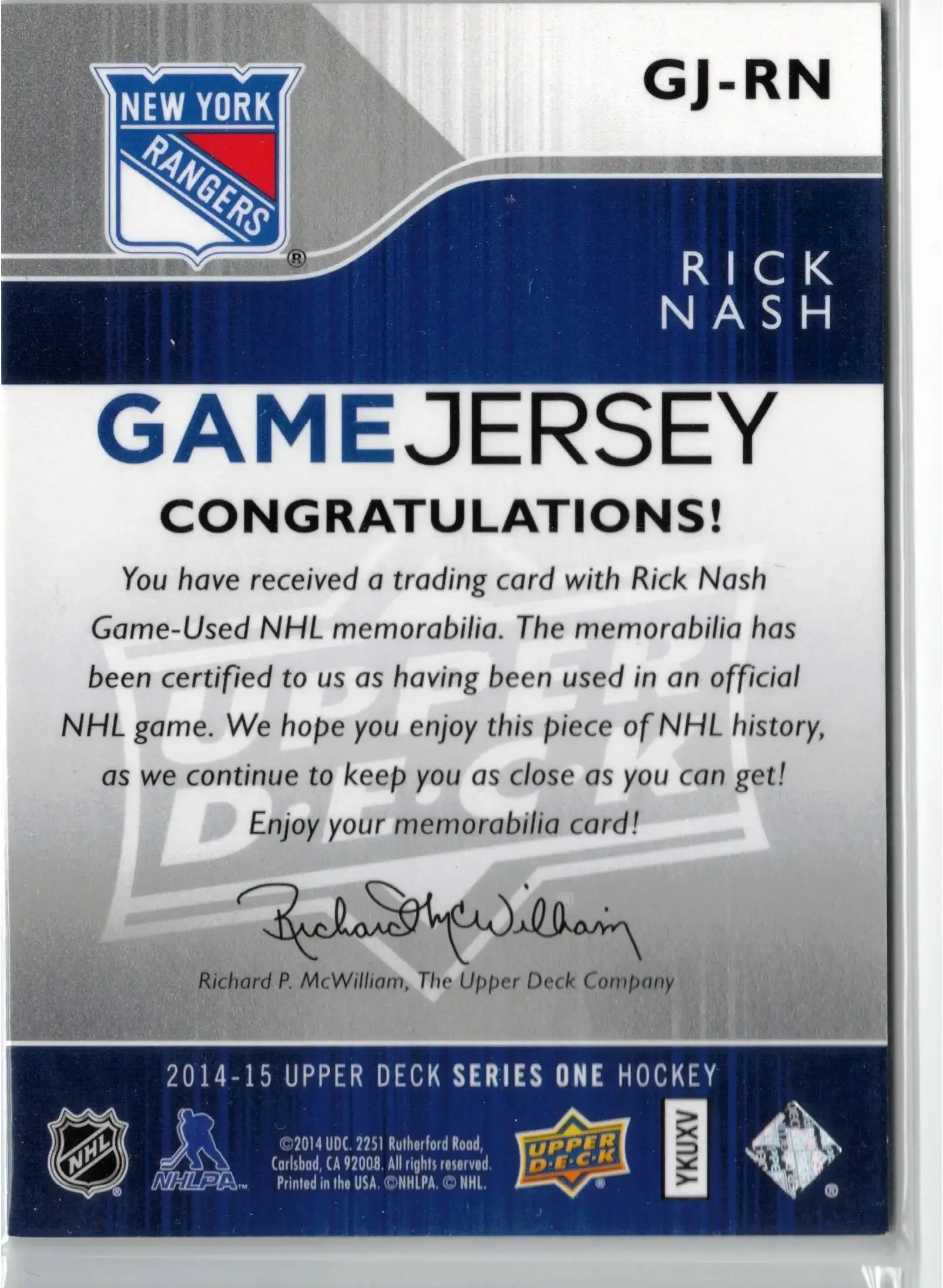 2014-15 UD Rick Nash GU Jersey New York Rangers