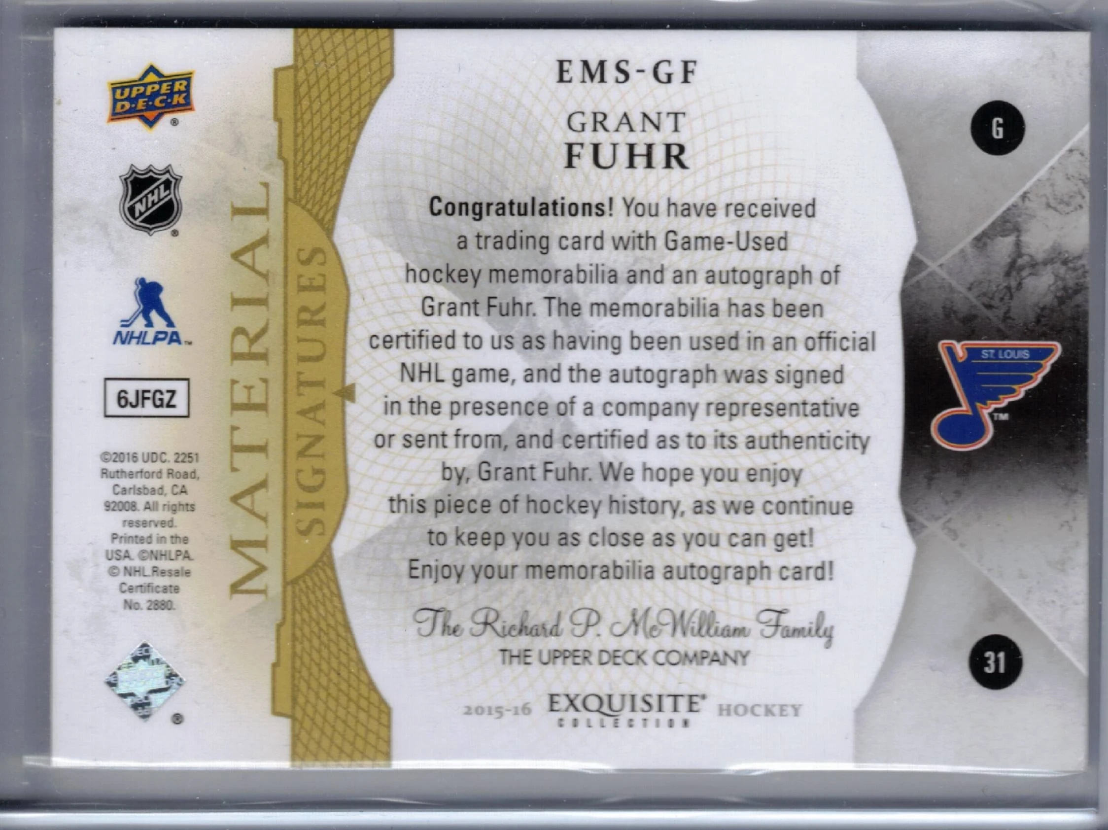 2015-16 UD Exquisite Material Grant Fuhr 06/99